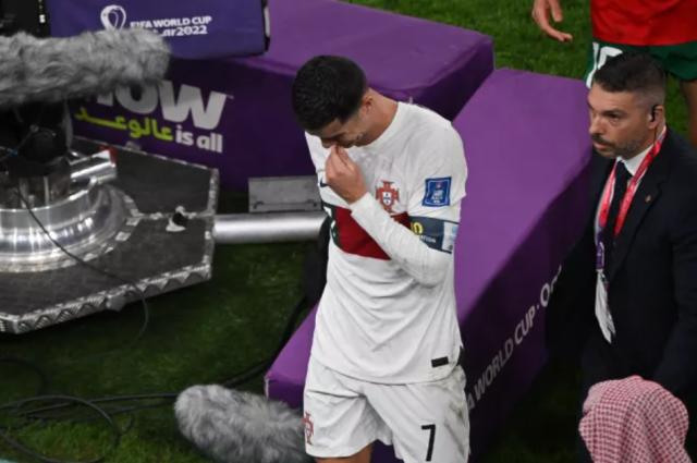 但最终的剧本走了悲情的路子:第51分钟顶替贡萨洛·拉莫斯替补上场时,葡萄牙队0比1落后,陷入摩洛哥人的铁桶阵,C罗也无力回天,个人第5届世界杯,最后一届世界杯,就这样提前结束了,主裁判终场哨响,C罗哭了。